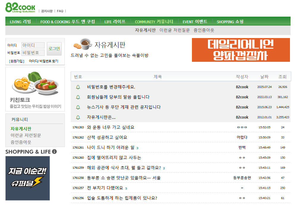 82쿡(82cook) 자유게시판은 생활의 지혜와 현실적인 공감 글로 유명한 커뮤니티예요.